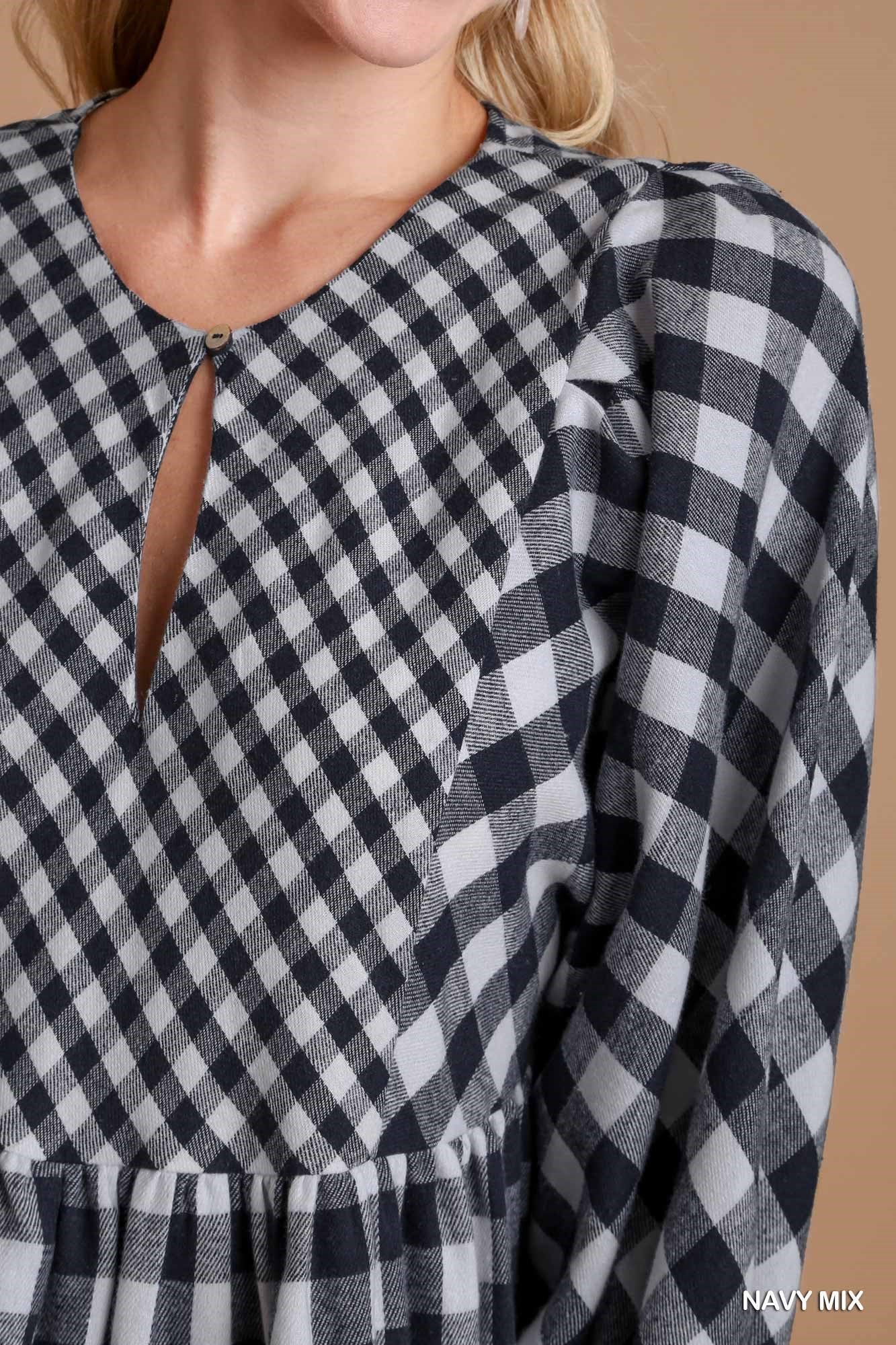 Contrast plaid babydoll dress with 3/4 sleeves. Gorgeous navy plaid design in loose fit.